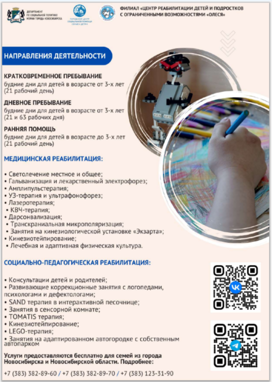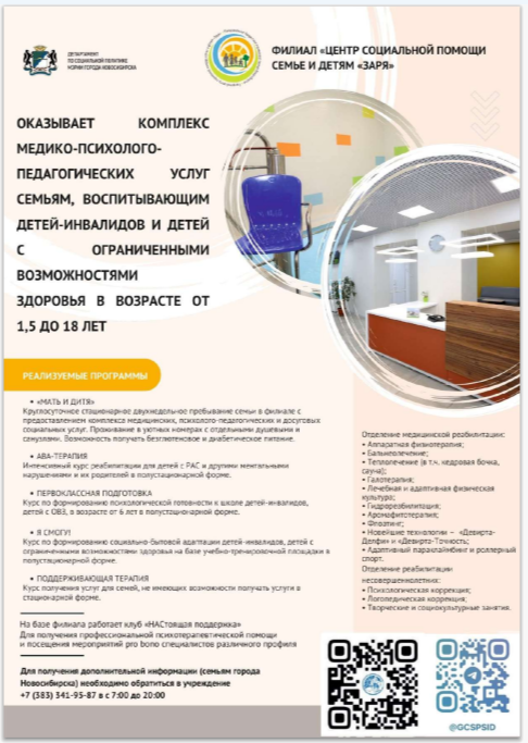 муниципальным бюджетным учреждением города Новосибирска «Городской центр социальной помощи семье и детям» создан уникальный комплекс реабилитационных услуг семьям, воспитывающим детей с ограниченными возможностями здоровья и инвалидностью в возрасте от рождения до 18 лет на безвозмездной основе на базе трех филиалов – «Центр социальной помощи семье и детям «Заря», «Центр реабилитации детей и подростков с ограниченными возможностями «Надежда» и «Центр реабилитации детей и подростков с ограниченными возможностями «Олеся».