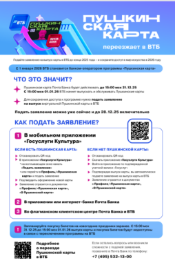 можно подать заявление: через приложение «Госуслуги.Культура», лично в отделении Почта Банка или Банка ВТБ. онлайн в приложении Почта Банк. Для получения пластиковой карты - обратиться лично в отделение Банка ВТБ с 12.01.2026, предъявив паспорт и СНИЛС.